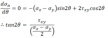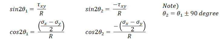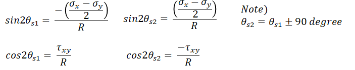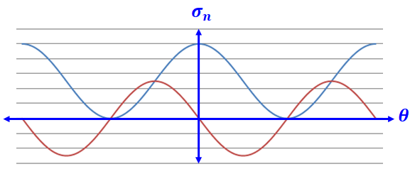 그리고 위 sigma_n의 함수는 180도의 주기를 갖는 주기함수이므로 또 다른 주응력은 위 식에서 나온 theta값에 대해 ±90도를 하면 구할 수 있다.(주응력의 위치에서 90도 평행이동 한 위치가 극소점 또는 극대점을 갖을거라는 의미)