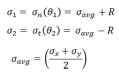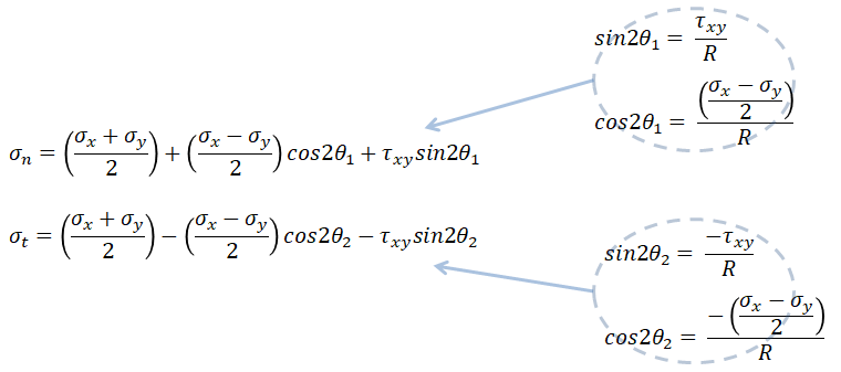 위 식을 R과 함께 이 포스팅 맨 위에 나온 sigma_n과 sigma_t에 대입하여 정리하면 주응력은 다음과 같이 정리된다.