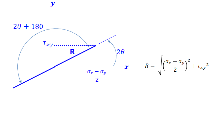 위 미분을 통한 탄젠트 식을 축 좌표계로 표현해 보면 다음과 같다.(아래 좌표계의 각도가 2theta임을 주목하자. 두번쨰 주응력 값은 90를 이동한 값이 아니라 180이동한 값이다.)