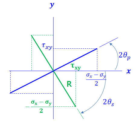 주목할 점은 주응력의 방향(파란색 선)과 최대전단응력의 방향(녹색 선)이 45도 각도를 갖는다는 것이다. (위 좌표는 2theta이므로 90의 각도는 45도 각도를 의미함.)