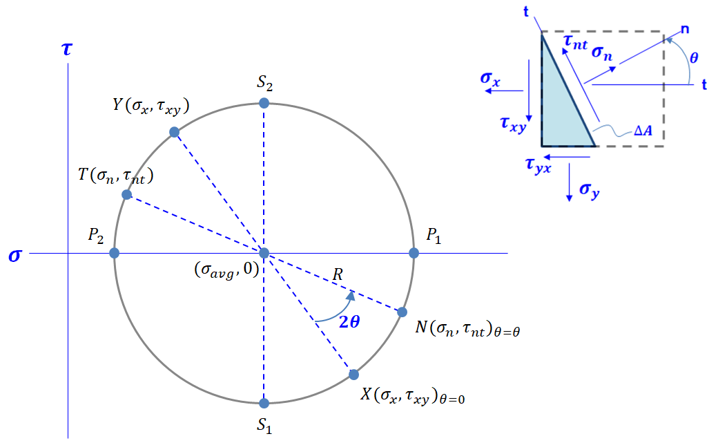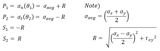 위 식에서 P1, P2, S1, S2는 각각 두 면의 주응력과 두 최대전단응력을 말한다. 이는 아래의 수식과 같이 도식적인 방법을 통해 알 수 있다. 즉 주응력은 원의 방정식이 x축과 교차점에 발생하고 최대전단응력은 원의 방정식의 최대, 최소값이다.