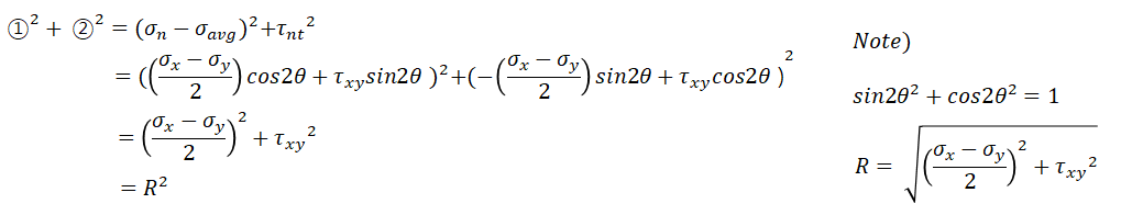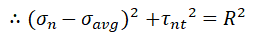 위 수식의 결론은 아래와 같이 sigma-n을 x축으로 하고 tau-nt를 y축으로하는 원의 방정식이다. 이 방정식은 중심이 (sigma_avg, 0)에 위치하고 반지름이 R이다.